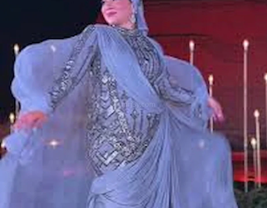 ارتدت فستانًا طويلًا بأكمام طويلة باللون الرمادي الفاتح، تزيّنه تطريزات راقية عززت حضور الإطلالة ومنحتها طابعًا متناسقًا وهادئًا.