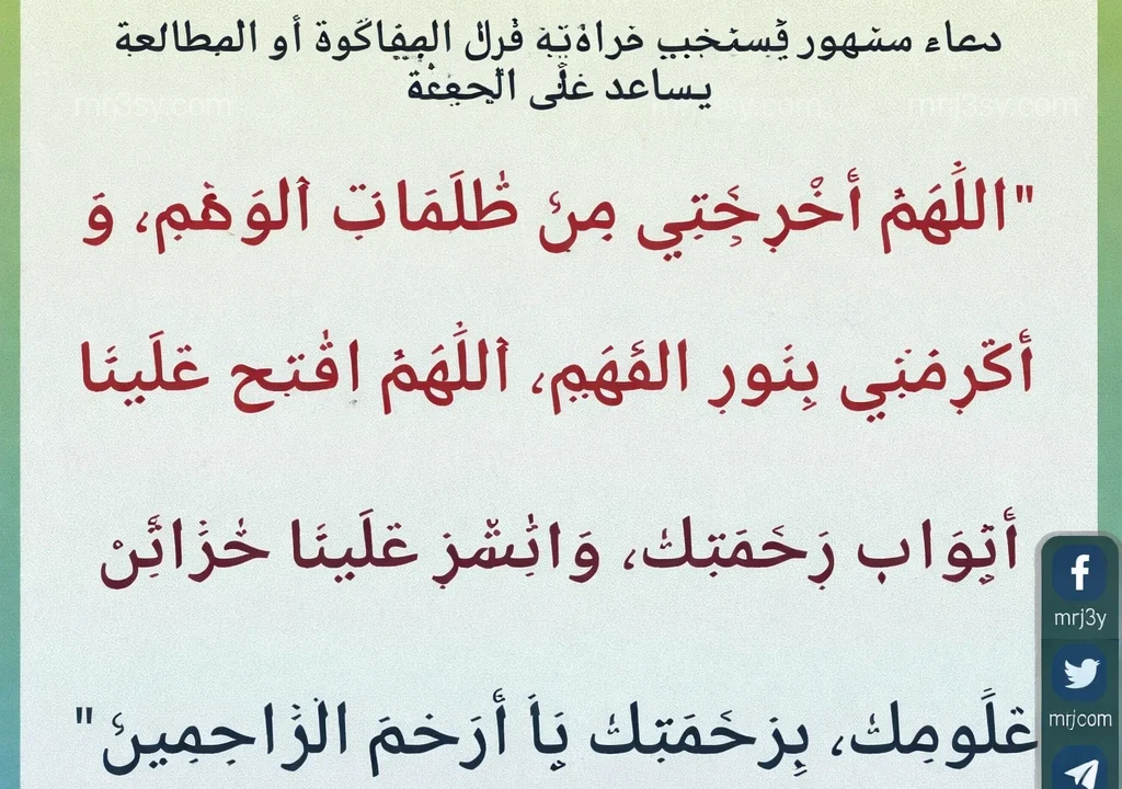 كما ورد دعاء اخر للحفظ من المخاطر، يتضمن طلب الامان في الدين والدنيا، الى جانب الاستعاذة من الشرور المحيطة بالانسان. النصوص جاءت واضحة.