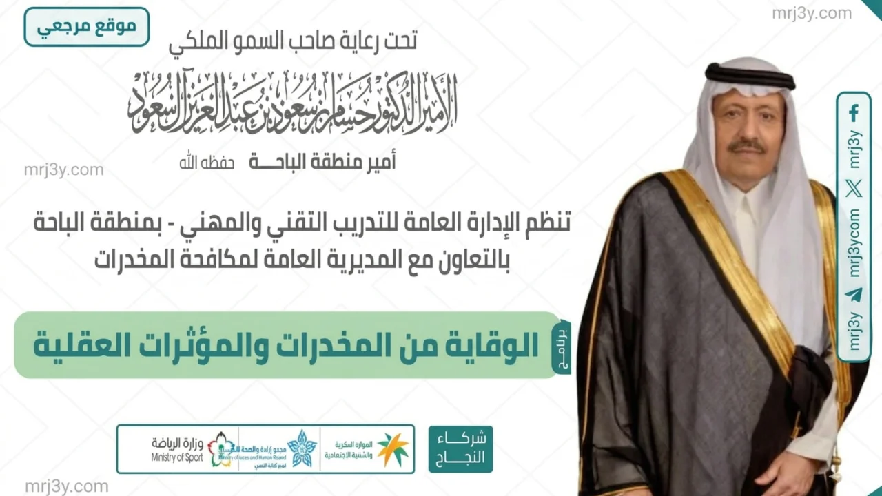 انطلق اليوم برنامج الوقاية من المخدرات والمؤثرات العقلية في منطقة الباحة، برعاية الأمير حسام بن سعود بن عبدالعزيز، وتنظيم الادارة العامة للتدريب التقني والمهني بالتعاون مع مديرية مكافحة المخدرات، وذلك بمقر الادارة في الظفير، وبمشاركة عدد من الجهات ذات العلاقة.