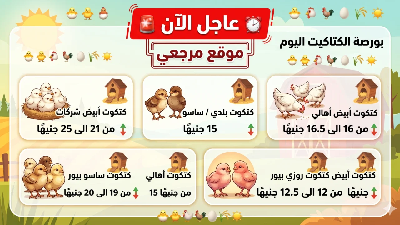 أسعار الكتاكيت اليوم مرشحة للتحرك داخل نطاق محدود هذا الأسبوع، بينما تبقى المتابعة اليومية أداة أساسية للمربين الراغبين في الشراء بأفضل توقيت.